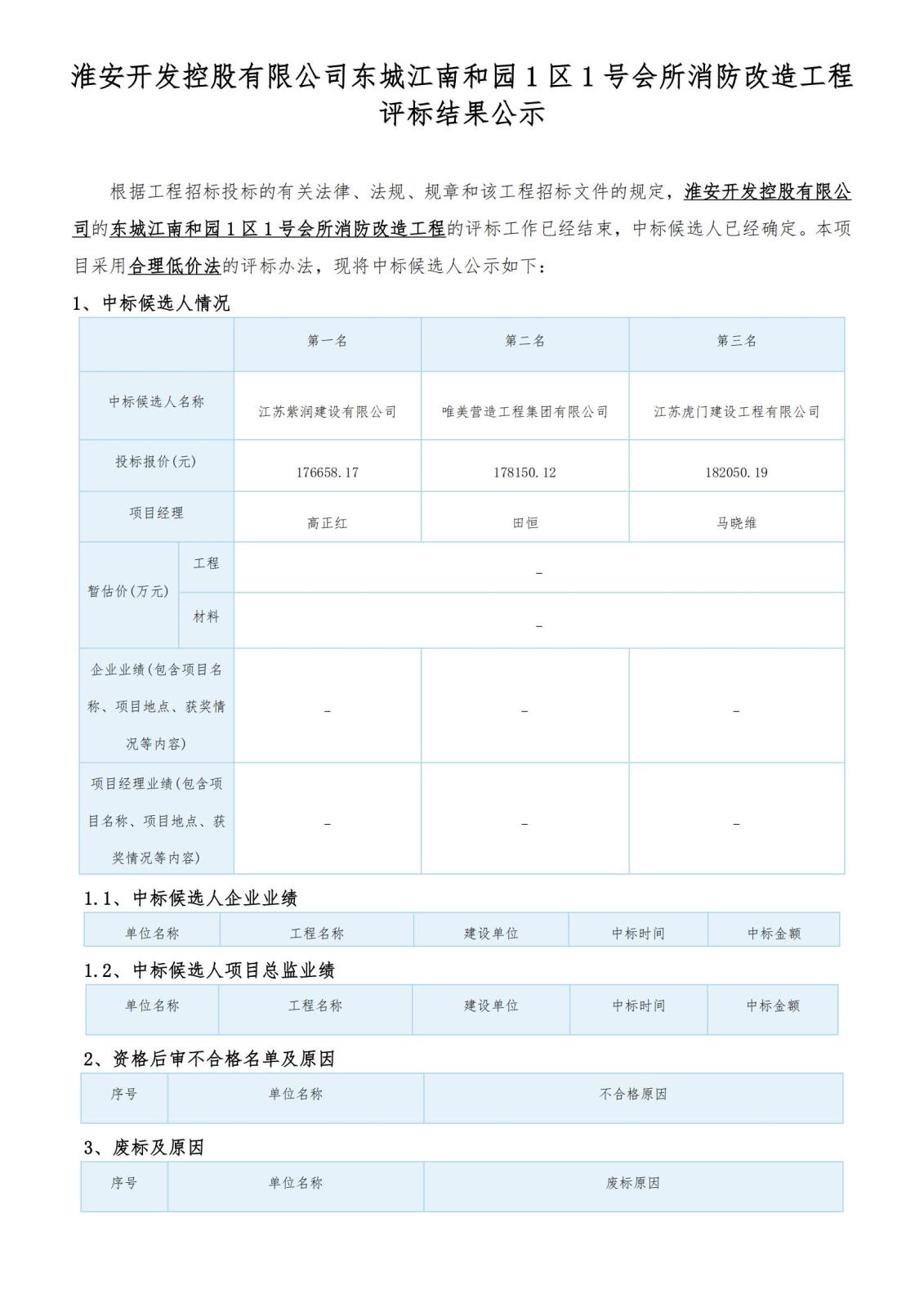 淮安開(kāi)發(fā)控股有限公司東城江南和園1區1號會(huì )所消防改造工程 評標結果公示
